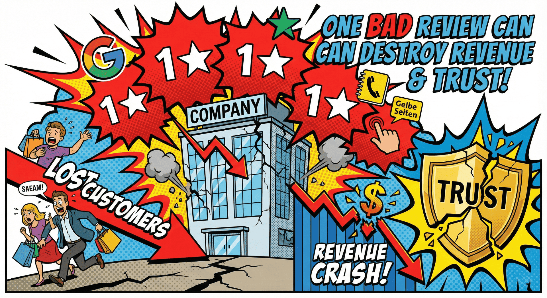 Google, Trustpilot und Gelbe Seiten sind keine isolierten Systeme. Negative Bewertungen wirken sich aus auf: