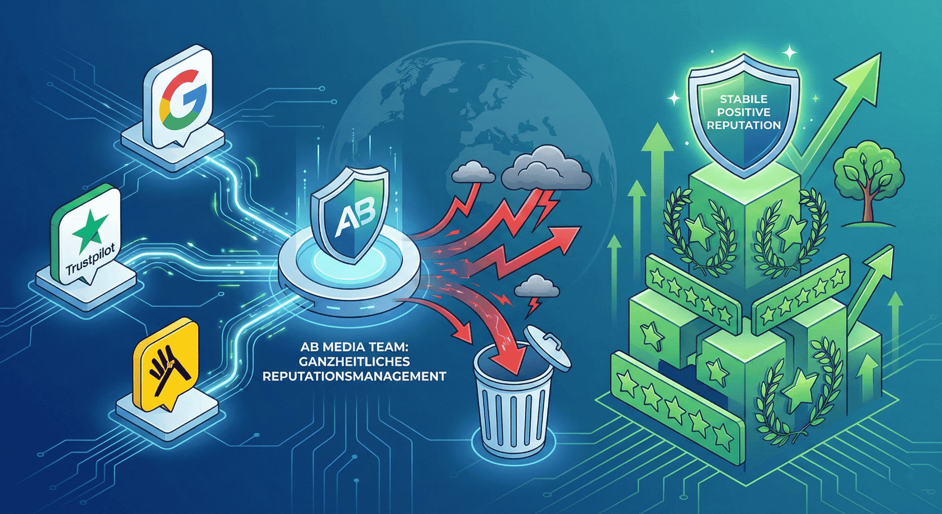 Google Bewertungen löschen, Trustpilot Bewertungen löschen und Gelbe Seiten Bewertungen löschen – all das sind wichtige Bausteine für Ihren geschäftlichen Erfolg. Mit AB MEDIA TEAM an Ihrer Seite haben Sie einen Partner, der weiß, wie man Google 1-Sterne-Bewertung löschen lässt und dabei Google Bewertungen löschen lassen legal handelt.