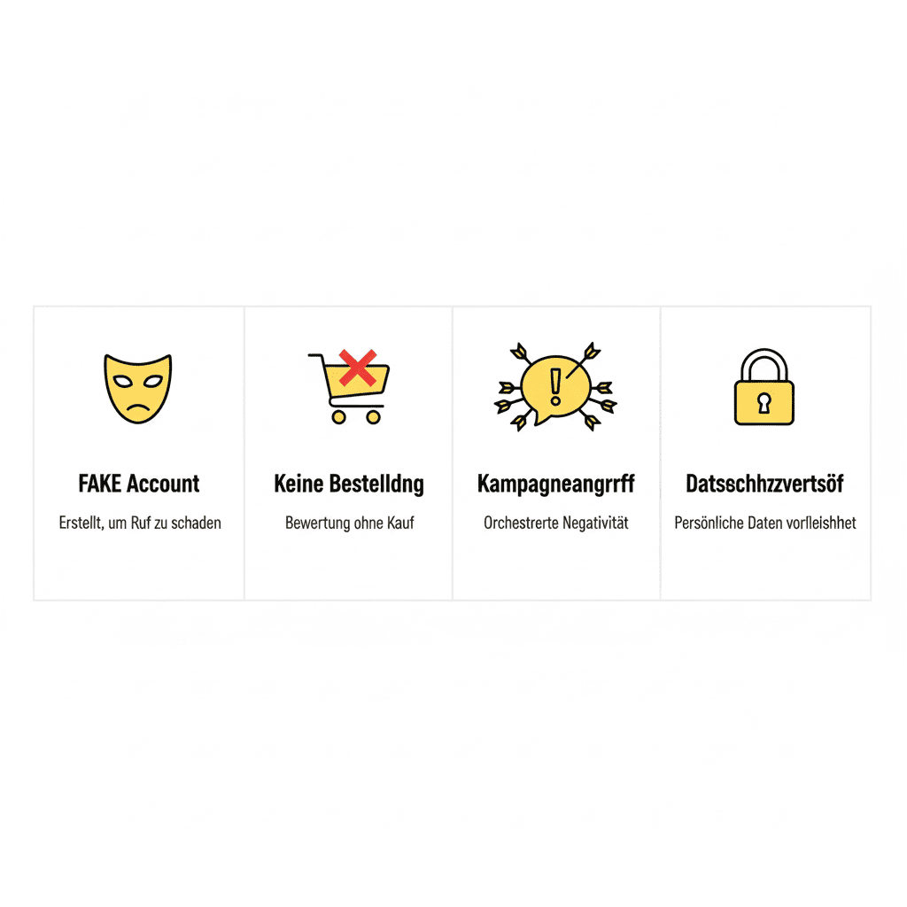Sehr häufig, besonders im E-Commerce: Die Person hat nie bestellt oder die Bestellung abgebrochen – trotzdem gibt es eine negative Bewertung. Oder die Lieferung verzögerte sich durch DHL, aber die Schuldzuweisung richtet sich an das Unternehmen. Wenn kein Kauf stattgefunden hat, ist die Bewertung angreifbar.