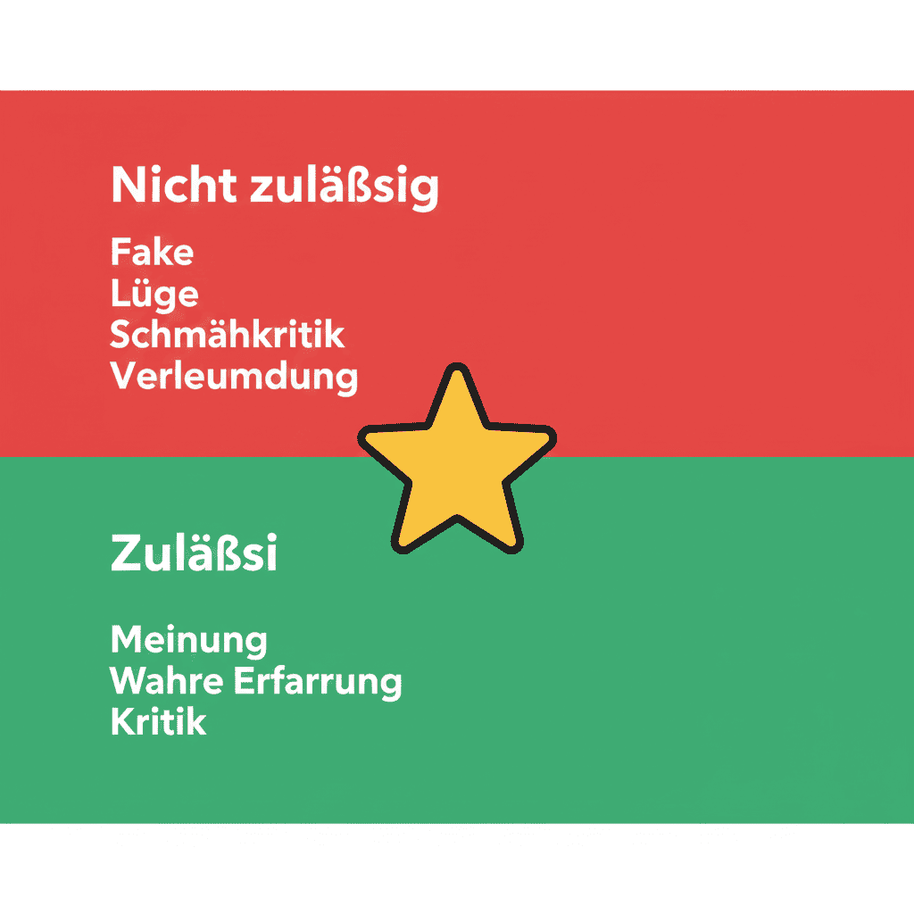 • Subjektive Meinungen (solange nicht beleidigend): Beispiele: "Service war langsam", "Ich war enttäuscht", "Nicht empfehlenswert". Selbst wenn man anderer Meinung ist – dies unterliegt der Meinungsfreiheit.
