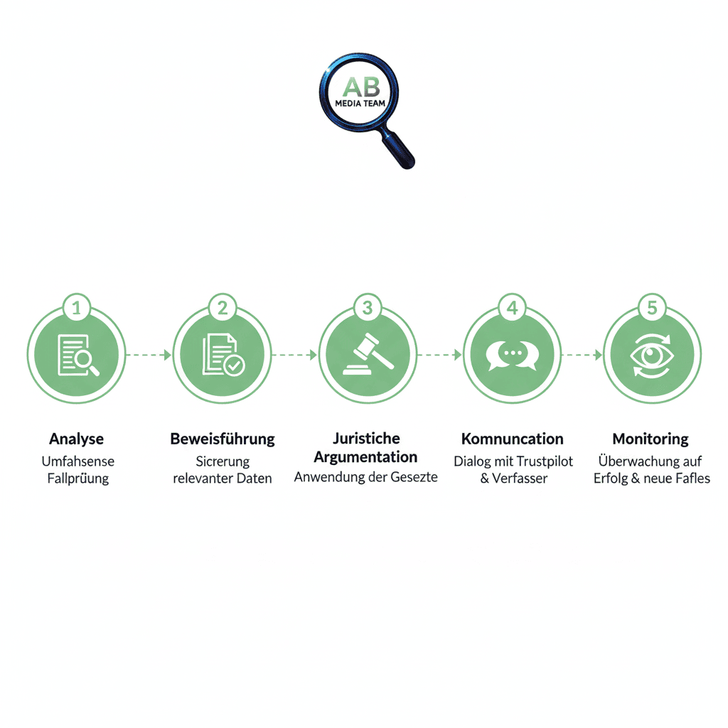 Die AB MEDIA TEAM Lösung: Da das Deaktivieren des Trustpilot-Kontos nicht möglich ist, liegt die Lösung ausschließlich in der aktiven Löschung unzulässiger Einträge in Kombination mit aggressivem Reputationsmanagement zur Verbesserung des Gesamt-Ratings.